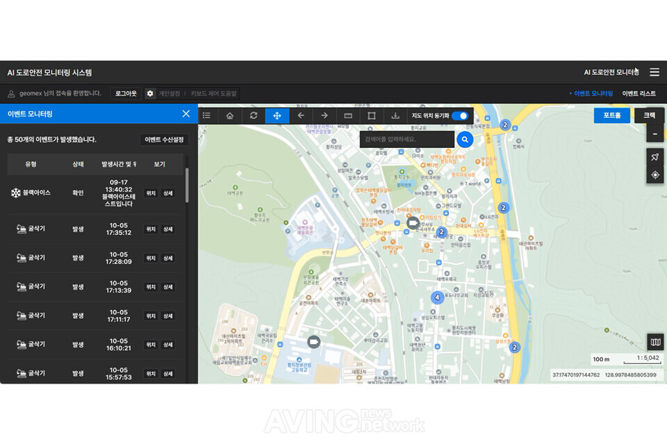 또한, 탐지된 위험 정보는 지오멕스소프트의 GIS 기반 통합 관제 플랫폼을 통해 시각화되어 지자체, 유관기관 등으로 실시간 전동된다. 이를 통해 관리자들은 현장의 영상을 즉시 확인하고, 사고 대응 및 도로 보수 등 필요한 조치를 빠르게 수행할 수 있다.